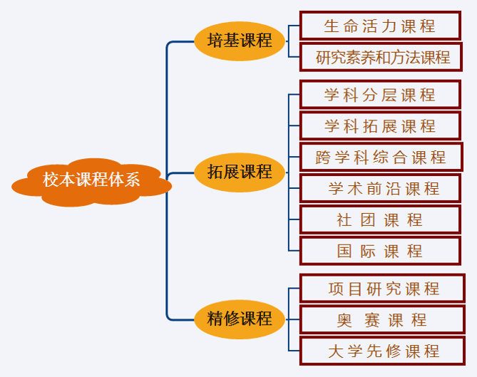 2.拓展课程,面向的是学生群体,属于自主选修课程,课程内容涉及学科分层课程、学科拓展课程、跨学科综合课程、学术前沿课程、社团课程、国际课程,满足不同学生兴趣和个性发展需要。