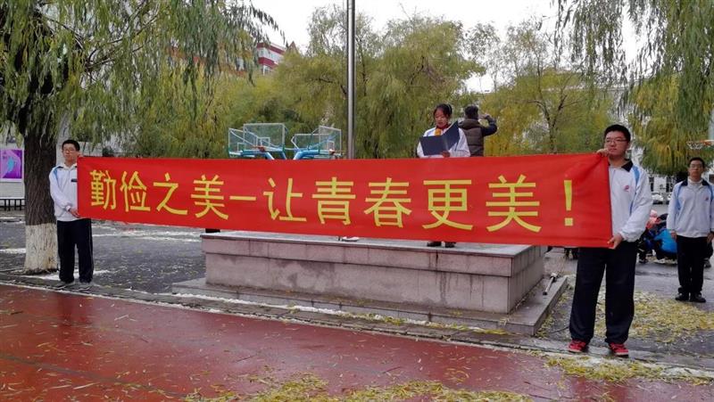 我身后是高二二班全体同学,他们共同用身体摆成了一个“俭”字,呼吁大家勤俭节约,共创节约校园!让我们相信:“勤俭之美——让青春更美!”