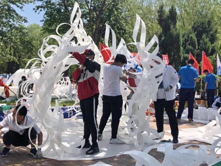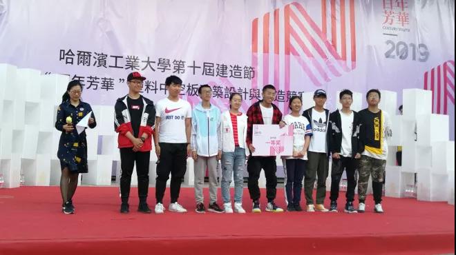 领奖照片 这次竞赛是用单张尺寸1.8米*1.8米,厚度5毫米的24张白色塑料中空板,以“百年芳华”为主题,为哈工大建校100周年校友返校设计交流空间,它要能同时满足4—6名校友欢聚、休憩时的坐卧需求。 我们的《龙脊》的确最美,技术难度最高! 而且经过两天两夜的大风检验,在它的左邻右舍纷纷歪斜倒塌的情况下,《龙脊》依然稳稳站立! 《龙脊》设计意图和理念 百年工大,如中华巨龙之脊梁,托起国家重任民族希望。由此,我们有了设计一架龙脊的想法。 部件设计灵感来自儿时折纸飞机轮,作品的结构呈“人”字形,体现了只有人与人之间合作支撑,才能在未来的时代竞争中万夫一力,所向无敌! 四条板条相互套连,紧紧相扣,单看是飞机叶轮,合起为美丽花朵。寓意工大未来必将含苞蓄势,一飞冲天。 作品由三组支撑骨架组成,寓意三人成众,只要我们每一个人与社会和国家互相依托,团结一致,定能创造出更美好的明天。 完成出这件作品,只有参与其中,才知它的不易。 我校代表队正式训练不足一个月,从划线,切割开始一点点学起,队员们集思广益,不断探究,设计方案,进行论证,付诸实验,可几次都因为强度不够,中途坍塌。 但一次次失败并没有让大家气馁, 反而激起了同学们研究的斗志。 甘苦自知的准备过程 5月18日,哈工大建筑学院邀请高中组参赛师生100余人,进行了建造节赛前培训,同学们收获颇丰,终于在第七次的创意中,设计出了用四条板材编织嵌套拧成叶轮的方式,增强了支撑的坚固性,取得成功!这时,距离比赛仅剩下四天时间。 这期间男孩们中午刚打完体育节的篮球赛,换下运动衣,来不及擦一下汗水,就拿起了电钻; 女孩们从塑料板上站起,摘下手套,掐着点跑向操场,参加啦啦操的评比; 24张塑料板量算着裁剪,切割,编织,钻眼,固定,提前两天进组,做好零件的准备工作,每天忙到晚上九点半,男子汉有担当,巾帼也不让须眉。 激动人心的比赛现场 比赛的日子到了! 队伍领到“建造许可证”后, 开始在哈工大图书馆广场门前“盖房子”。 我们的队员们有条不紊地各司其职,忙而不乱,边讨论,边尝试改进,从早上八点到下午三点,选手们连续七小时工作,顾不上吃午饭,有的还带伤工作,一鼓作气,用数量有限的板材搭造着梦想中的殿堂。 成功背后的付出 取得今天的成绩,最应当感谢的,就是陈醉老师,自从2015年第六届哈工大建造节首次邀请省重点高中参加以来,陈醉老师就带领我校代表队开始参赛,至今共获得一等奖两次,二等奖三次的好成绩,作为资深的专业指导教师,每一年的队员,都要从零培养,他不急不躁敢于放手,让孩子们充分发挥创造力,自主克服困难,解决问题,又总是能选取恰当时机,高屋建瓴地做出专业指导,无愧为多次被评为优秀指导教师,有这样专业的指导教师,省实验的队员也成为了其他兄弟学校学生羡慕的对象。