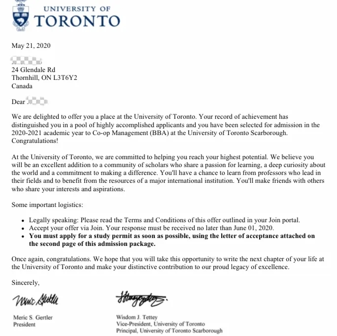 高雪儿是OSSD项目的第一届学生。于2019年8月到加拿大安博逊高中就读12年级。此次申请大学,斩获多伦多大学三个校区的数学、商科及管理专业的offer,其中多伦多大学士嘉堡校区的带薪实习专业(Co-op)BBA是最难申请的专业之一。除此之外,她同时还收到了麦克马斯特两个专业及西安大略大学的offer。下面首先让我们来目睹让许多留学生神往的大学offer 是怎样的。