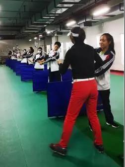 在训练击球时,为了能够击中球,同学们的身体总会不由自主的向下倾,结果尽管能击中球但也让这优美的动作打了折扣,影响了命中率。马教练耐心的指导同学,纠正击球姿势。