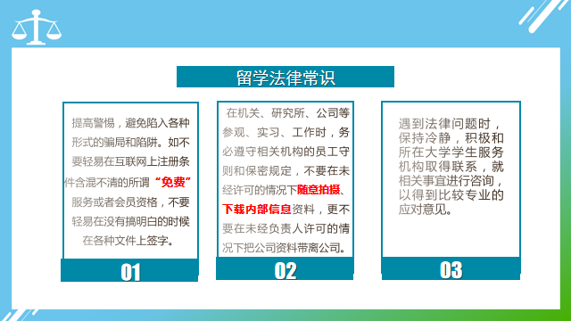 孙老师结合实际案例详细的讲解了英国、美国、澳大利亚和加拿大四个国家的留学生必备法律常识。让同学们了解迈出国门我们哪些不当言论、不当行为会触犯法律。